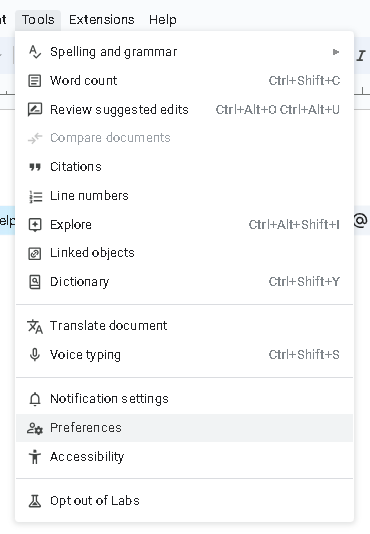 1. Open a Google Doc and go to Tools > Preferences in the menu.